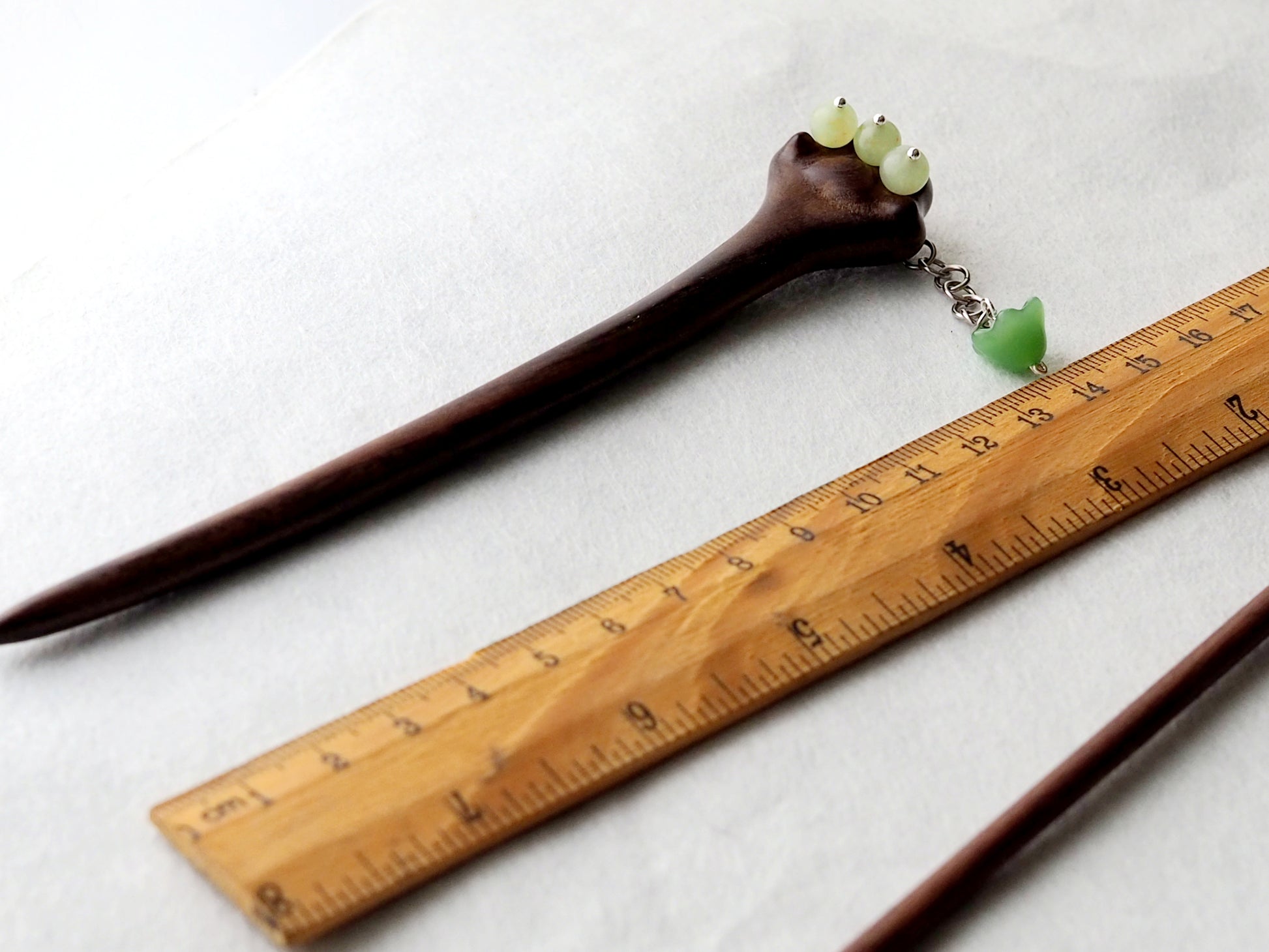 - Due to the natural variations in wood grain and jade color, each hair stick will be unique.